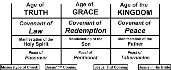 Jerusalem, Israel is the eternal capital of the earth where Jesus the Jewish Messiah will be king over all the kingdoms of the earth. Ezekiel chapters 40-48 describes His temple building which will serve as a 1,000-year object lesson for His Bride the Church who will be learning to BE the eternal temple. The reason that God has brought the natural nation of Israel back together in our generation is to set the stage for Jesus' Millennial Kingdom. This 1,000 year period is mentioned six different times in Revelation 20:1-7, and is also very clear about who will be reigning with the Messiah: "the souls of those who had been beheaded for their witness to Jesus and for the word of God, who had not worshiped the beast or his image, and had not received his mark on their foreheads or on their hands. And they lived and reigned with Christ for a thousand years." These souls beheaded for their testimony of Jesus, along with the martyrs mentioned in Rev. 6:9, and the two witnesses who are murdered in Rev. 11:7 could be considered the "shed blood" that all God ordained Covenants witness. The Covenant of Law was witnessed with the blood of bulls and goats. The Covenant of Redemption was witnessed with the blood of Messiah Jesus, which makes valid all of the Covenants. And the Covenant of Peace will be witnessed with the blood of those who have followed, and will follow, in the footsteps of their mentor Jesus and lay down their lives. "And they did not love their lives to the death" (Rev. 12:11). "Precious in the sight of the Lord is the death of His saints" (Psalms 116:15). Likewise, all of God's ordained Covenants are "sealed" or have some kind of a "sign" for authenticity. The Covenant of the Law had the sign of the seventh day Sabbath (Exodus 31:12-18): "My Sabbath is a sign between Me and the children of Israel forever." The Covenant of Redemption had the sign or seal of Jesus' bodily burial and resurrection (John 6:27, Luke 11:29). The Covenant of Peace is sealed by the Holy Spirit (Eph 4:30, 2 Cor. 1:22). "You were sealed with the Holy Spirit of promise, who is the guarantee of our inheritance until the redemption of the purchased possession" (Eph. 1:13,14). We, the saints, are God's purchased possession and our redemption is not complete until Jesus returns and redeems our bodies as well. (Read 1 Cor. 15:35-58 to see this promise of eternal incorruptible bodies) The return of Jesus is the beginning of this coming new age of peace. The disciples asked Jesus, "What will be the sign of your coming and of the end of the age? Jesus answered them and said, " the sign of the Son of Man will appear in heaven, and then all the tribes of the earth will mourn, and they will see the Son of Man coming on the clouds of heaven with power and great glory" (Matt. 24:3,30). However, Jesus will first return IN His mature sons before He fully returns physically. His Second Coming will be a progression like it was when He came the first time and was: 1) incarnated & born, 2) grew up, and 3) finished His earthly ministry. The Second Coming of Christ will be further discussed in chapter 14, but it is sufficient here to say that His Second Coming will be the sign that the Millennial Age has begun. The chart below adds more understanding onto the first chart shown at the beginning of this chapter:
