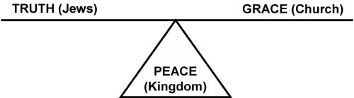 As the figure above shows, the correct combination of Truth and Grace (Natural order and spiritual reality) will characterize the peace of the Kingdom Age. The truth of the natural order was given through Moses in the law, and truth as a spiritual reality came with grace through Jesus. The Kingdom of God being manifested during the next 1,000 years will be the perfect balance between Truth and Grace as the above figure shows. This is the Life of Messiah being duplicated in His children or mature sons. God is in the process of making us into His image. Jesus is our perfect example, and His life was the perfect example of truth, grace and peace. The destiny of mankind is to reflect these characteristics as Jesus did when He walked the earth. Since ALL of Peter & Paul's epistles in the new testament begin and/or end by writing "Grace and Peace" to us, we can be sure these are major building blocks that God has been trying to instill in mankind for thousands of years. Jesus wept over Jerusalem saying, "If you had only known, especially in this your day, the things that make for your peace! But now they are hidden from your eyes" Luke 19:42. Israel had God's truth, but was blinded to most of His grace. Therefore, the peace they desired was not yet possible because true peace requires the divine balance of understanding both Truth AND Grace. Just like a balanced diet is a pre-requisite to good health, having a BALANCED spiritual diet will be a key characteristic in those who will partake in the coming Age of Peace.