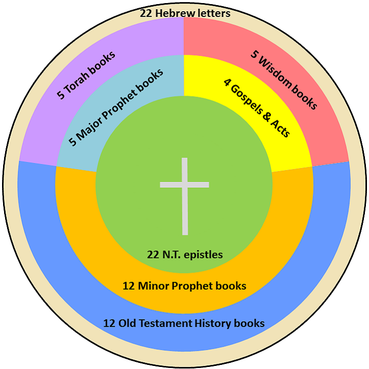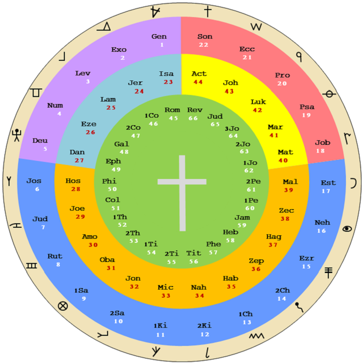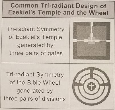 of Jesus!! Hebrew is written from right to left, so everything in the covenant circle flows in a counterclockwise direction. There are 22 letters in the Hebrew alphabet, and this covenant circle uses the ancient Hebrew letters which are hieroglyphic where each letter is also a picture of something.(2) Each one of these letters is a living angelic being that is aiding mankind in bringing the Word of God on earth. Each messenger angel lines up with 3 of the 66 books of the Bible. For example, the first letter Aleph includes Genesis in the first circle, Isaiah in the second circle, and Romans in the third circle. Each of the 22 groups, containing three Bible books and its corresponding Hebrew letter, have amazing similarities and themes to them. The number and word patterns in each group shows divine design and purpose far beyond random coincidence. For example, the 4th Hebrew letter dalet means door, and contains the book of Ezekiel who describes in detail the doors/gates of the millennial temple. Richard McGough shows a comparison between what he calls the Bible Wheel and Ezekiel's temple.(3) Notice how both patterns point to the sacrificial altar and cross at the center.