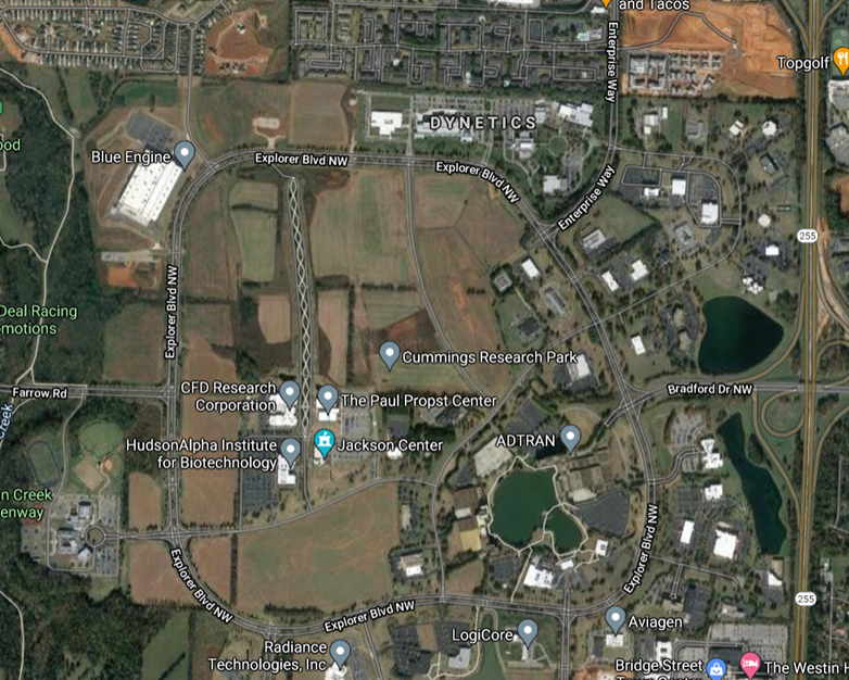 The two most obvious similarities between this circle of Solomon and the Covenant Circle presented in this writing are the 22 letters on the very outside, and the cross in the middle. This black circle above is another "decipher key" used by the occult that includes letters, numbers and symbols.(4) It is very interesting how the occult uses God given keys for selfish purposes, and God allows it to test our hearts. Even satan and all his devils are being used for a purpose to refine us. We cannot cast out these principalities before their purpose is finished. They will attract those with kindred spirits. "Mystic Wheel" or "Magical Circle" is what these "pentacles" are called in The Key of Solomon book. But they are just cheap copies of God's Covenant Circle, often used to conjure up devils, demons and evil principalities. But onward to what the Covenant Circle is all about. The details of the 66 books of the bible rolled up into 3 concentric circles and overlapping each other is nothing short of phenomenal! God is the master mathematician, who chose these 66 books and none other to represent HIS Covenant in Christ Jesus. I like to read extra biblical books, like Enoch, Jasher and Macabees, but no other book has the supernatural numerical patterns found in it like the current 66 biblical books. God chose these 22 angels to assist in bringing forth the right books at the right time through His chosen human vessels. If we embrace this truth, then we can learn how Holy Spirit uses this Covenant Circle with His messengers (angels) to bring His Kingdom in the earth today as well. This covenant circle is just a two dimensional graphic of God's multidimensional living Word brought to us through messengers. Today is the LORD's Passover, and last night we celebrated it together by eating some good food, sounding the shofar, taking the LORD's communion, and worshipping king Jesus at my workplace.(5) There is a connection with this 2021 Passover celebration and the Covenant Circle being released in this particular location. Huntsville Alabama is the cradle of American space exploration, and a spirit of knowledge has always been the gift of God for this region. Werner Von Braun and operation paper clip tapped into this knowledge-spring here, but it can also be used for redemptive purposes. This Covenant Circle is one of them. Below is an aerial photo of this "circle" of knowledge that is called Research Park here in Huntsville.