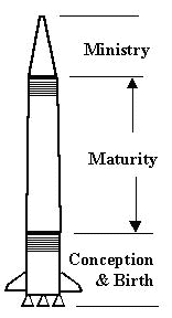 The second stage of His coming, which is the longest phase, is the growth of God's government (manchild) on the earth. This second stage can be compared to the 30 years before Jesus started His ministry where He was growing in spiritual maturity. The third and final stage of this rocket is the 3 ½ year ministry of the "two witnesses" discussed in Revelation chapter 11 and can be compared to Jesus' 3 ½ year ministry. These final two stages will destroy the "lawless one" by the "brightness of His coming" (2 Thess. 2:8). The Greek word "coming" in this verse is "parousia" and refers to the coming of God's manifest presence and glory IN His people. These final two stages will include the return of the risen Lord to empower His people with His presence that will bind Satan and render him powerless to deceive people anymore. Jesus will return the same way that He did the first time at His resurrection. Again, the Scriptures have established a pattern for beginnings and endings. He did not return to unbelievers, but only to those looking for Him. He will simply appear to individuals and groups of people, as He chooses, to give them direction in establishing His kingdom on earth. There is much to say on this aspect of His return, but this writing is for the purpose of looking at the first stage of this rocket, which is the birthing of Christ IN His mature sons. For more information on how the Lord will return physically, please read on the internet: "The Shekinah Glory of Christ at His Coming" by Roland Pletts.22